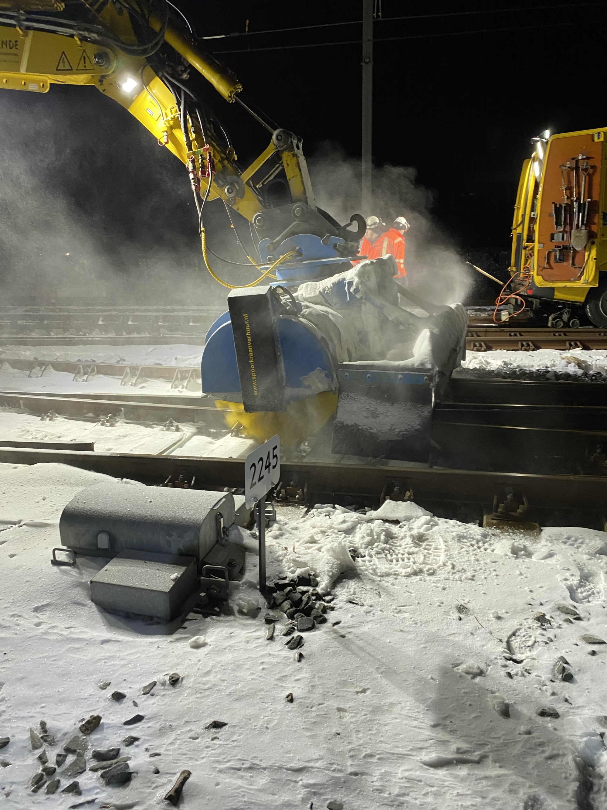 Toen de dooi inzette, smolten bevroren wissels letterlijk als sneeuw voor de zon. Maar dat levert ons wel weer nieuwe problemen op. Na zo’n vorstperiode krijg je namelijk klappers: verzakkingen. De grond onder het spoor is normaal gesproken dichte, vaste kleigrond hier in Zeeland, verzadigd met water. Door de vorst zet de grond zich vast, maar dat heeft geen gevolgen voor het spoor. Zodra het gaat dooien, ontdooit de grond en zakt het spoor in op de verzadigde onderlaag. Dus dan moeten we het spoor onderstoppen. Dat gaat handmatig, dan sta je de hele middag met een zware machine in je handen. Of we doen het in de nacht met een stopmachine of krol.