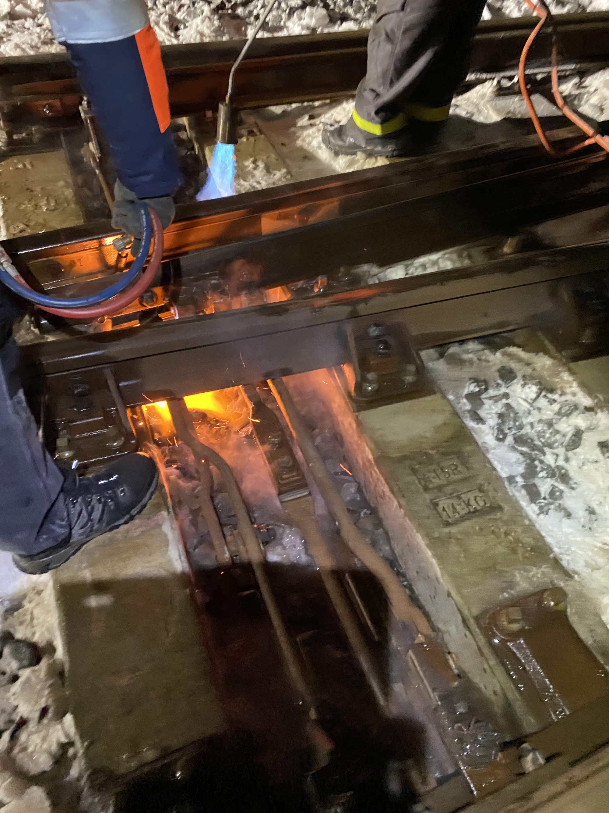 Ongeveer driekwart van alle wissels in Nederland heeft gasverwarming. Maar als het sneeuwt en hard waait, gaat het gasvlammetje uit en vriest de boel vast. Met elektrische wissels heb je dat probleem niet. We hebben de hele week gasverwarmde wissels ontdooid. Als blijkt dat een wissel is vastgevroren, vraag je eerst een buitendienststelling aan, zodat je veilig kunt werken. Één collega blaast met een grote blazer, een bladblazer eigenlijk, de losse sneeuw weg, de ander gaat er met een brander achteraan. Dan smelt het ijs. Dat is wel een aangenaam klusje, je voeten worden lekker warm. En als je de brander op een bepaalde manier richt, komt de warmte ook omhoog. Dan kan een ander ernaast gaan staan om een beetje op te warmen. Zo wisselden we af.