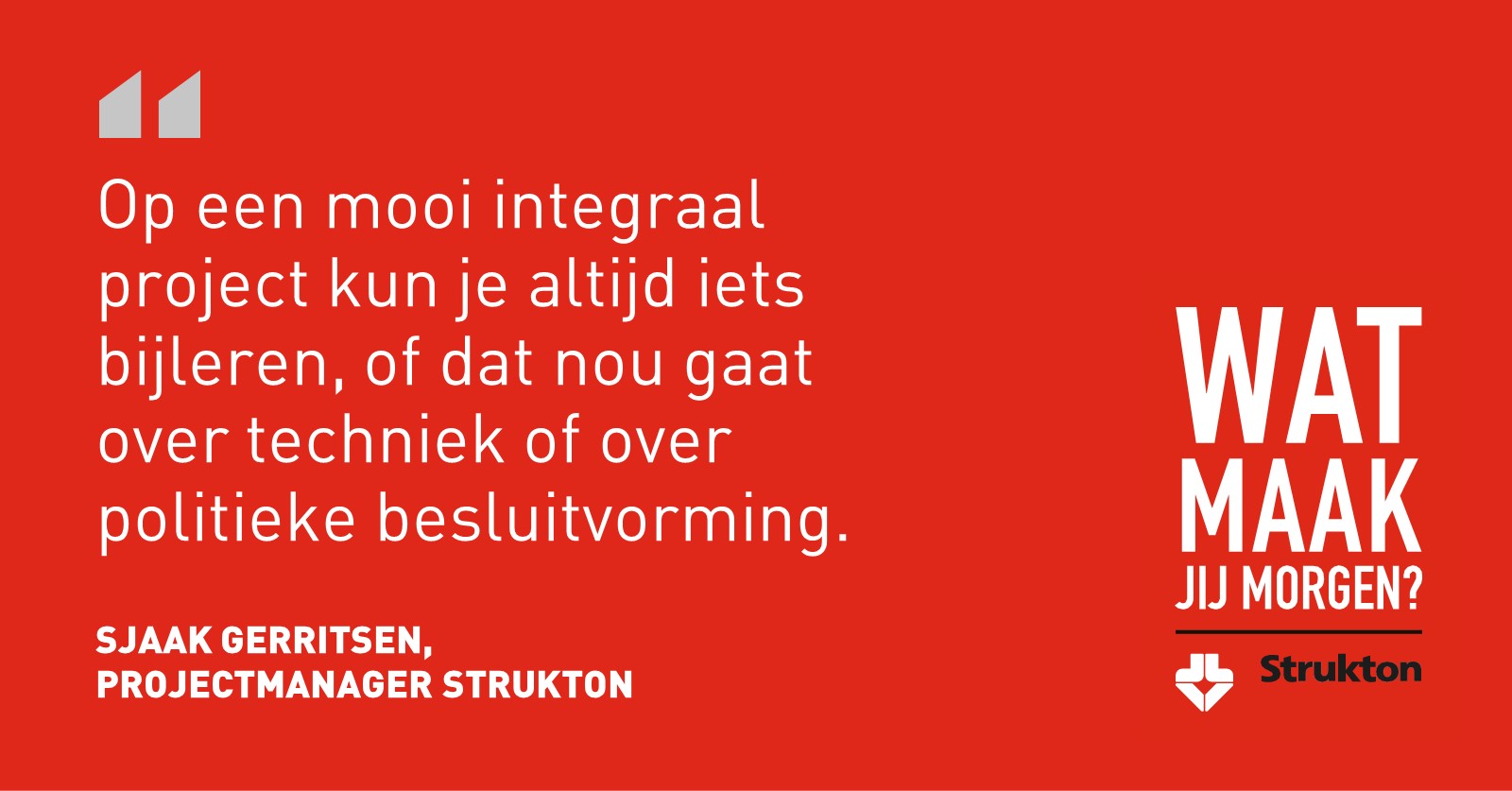 “Ik denk dat iedereen een verschil kan maken op een project, vanuit zijn eigen expertise.” Aan het woord is Sjaak Gerritsen, projectmanager bij Strukton Wegen & Beton. “Ik was projectmanager voor de A2/N2 in Eindhoven waar we een nieuwe onderdoorgang hebben gemaakt om de bereikbaarheid van Eindhoven Noordwest te verbeteren. Dit project hebben we uitgevoerd in een bouwteam samen met de gemeente Eindhoven. Samenwerken met onze opdrachtgever is in een bouwteamproject zoals dit heel belangrijk. Het maakt me trots om mensen te kunnen verbinden om samen een mooi project te maken, waarbij we gestructureerd en kwalitatief goed werk leveren. Aan het eind van een technisch uitdagend project staat er een zichtbaar resultaat om trots op te zijn. Een team dat samen zijn schouders eronder zet en een mooi resultaat neerzet is goud waard.”