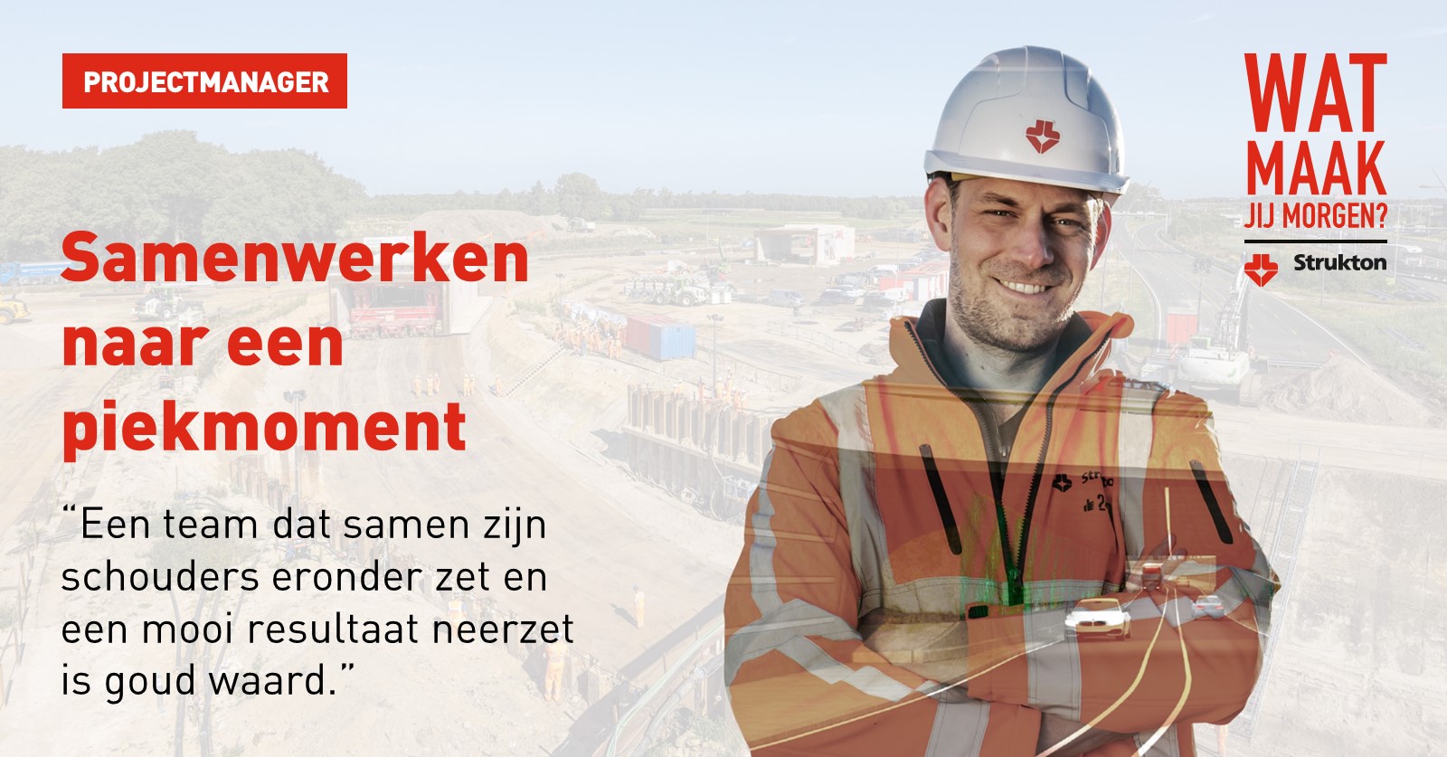 “Je krijgt de ruimte om te leren. Dat betekent dat je kunt blijven ontwikkelen. Ik denk dat dat heel belangrijk is voor je medewerkers. En uiteindelijk dus ook voor Strukton als bedrijf. Op een mooi integraal project – zoals de bouw van de tunnel in Eindhoven – kun je altijd iets bijleren. Of dat het nou gaat over techniek of over politieke besluitvorming. Dat maakt mijn werk als projectmanager heel erg leuk.”