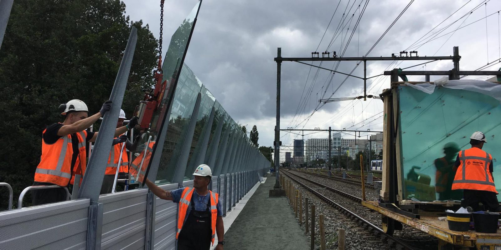 Dat geldt ook voor dit werk. Nadat collega’s de berm hadden gemaaid en de kabels en leidingen hadden verlegd, hebben we tijdens een buitendienststelling van 200 uur in het voorjaar het raamwerk voor het geluidsscherm gebouwd: 233 palen boren, 120 betonbalken van 6 meter erop leggen, plus wat overkluizingsbalken, en daarbovenop de stijlen zetten. In de zomer zijn we teruggekomen om tijdens een buitendienststelling van 100 uur vakken te vullen met cassettes en glas. Iedereen die weleens bij zo’n project in shifts betrokken is, weet dat het lastig is om aan het einde ervan de concentratie ervoor op te brengen. Toch vind ik dat heel belangrijk: we moeten het de eerste keer goed doen. Anders moeten we terug en dat kost geld.