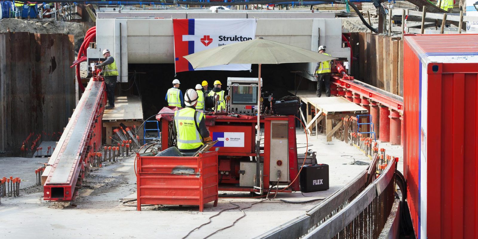 Een ander groot project waarbij Strukton Infratechnieken betrokken was, is de Noord-Zuidlijn. We hebben de fundering van station Amsterdam Centraal in zijn geheel tijdelijk overgenomen met vijzels. Nadat de nieuwe fundering, met daarin ruimte voor de nieuwe metrolijn, klaar was, hebben we de vijzels weggehaald. Ook het opvijzelen van bruggen – tijdelijk of permanent – is voor ons gesneden koek, net als boren, zowel horizontaal als verticaal, bijvoorbeeld voor mastfunderingen. Verder staat op ons portfolio het inschuiven van tunnelbakken, bijvoorbeeld voor een doorgang onder het spoor. Die tunnelbak bouwen we vooraf, vlak naast het spoor. Tijdens een buitendienststelling wordt het spoor doorgezaagd en wordt er een kuip gegraven voor de tunnel. Vervolgens schuiven we de tunnelbak met onze vijzels nauwkeurig op zijn plaats.
