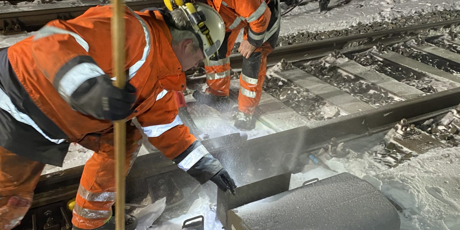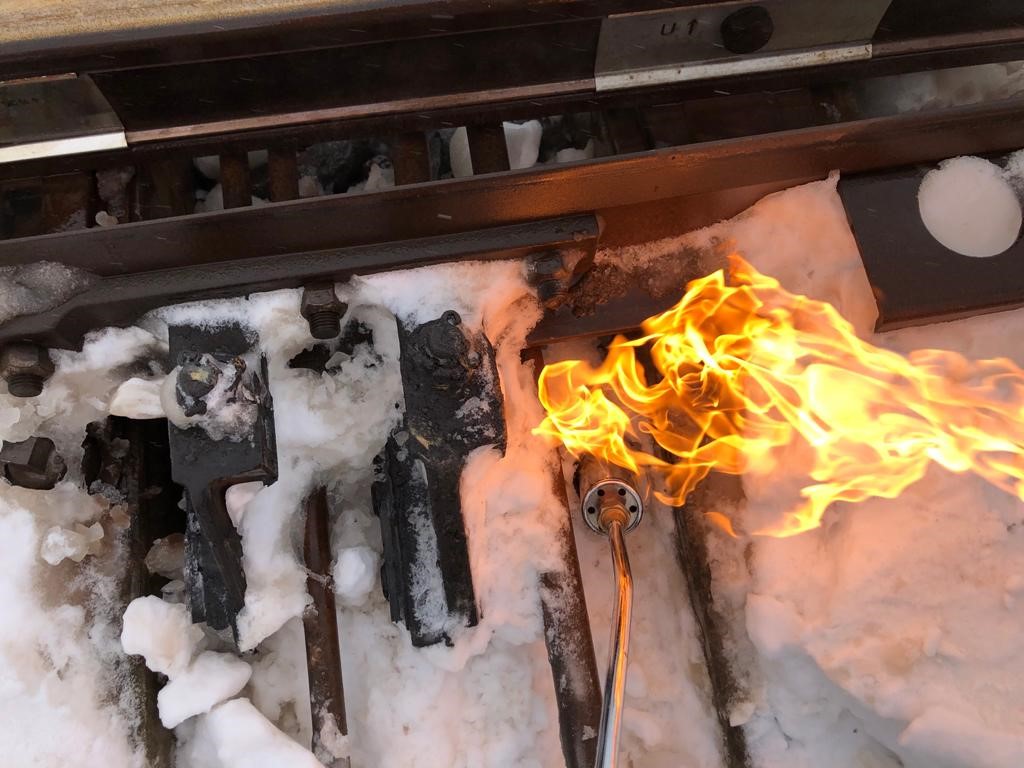 Ongeveer driekwart van alle wissels in Nederland heeft gasverwarming. Maar als het sneeuwt en hard waait, gaat het gasvlammetje uit en vriest de boel vast. Met elektrische wissels heb je dat probleem niet. We hebben de hele week gasverwarmde wissels ontdooid. Als blijkt dat een wissel is vastgevroren, vraag je eerst een buitendienststelling aan, zodat je veilig kunt werken. Één collega blaast met een grote blazer, een bladblazer eigenlijk, de losse sneeuw weg, de ander gaat er met een brander achteraan. Dan smelt het ijs. Dat is wel een aangenaam klusje, je voeten worden lekker warm. En als je de brander op een bepaalde manier richt, komt de warmte ook omhoog. Dan kan een ander ernaast gaan staan om een beetje op te warmen. Zo wisselden we af.