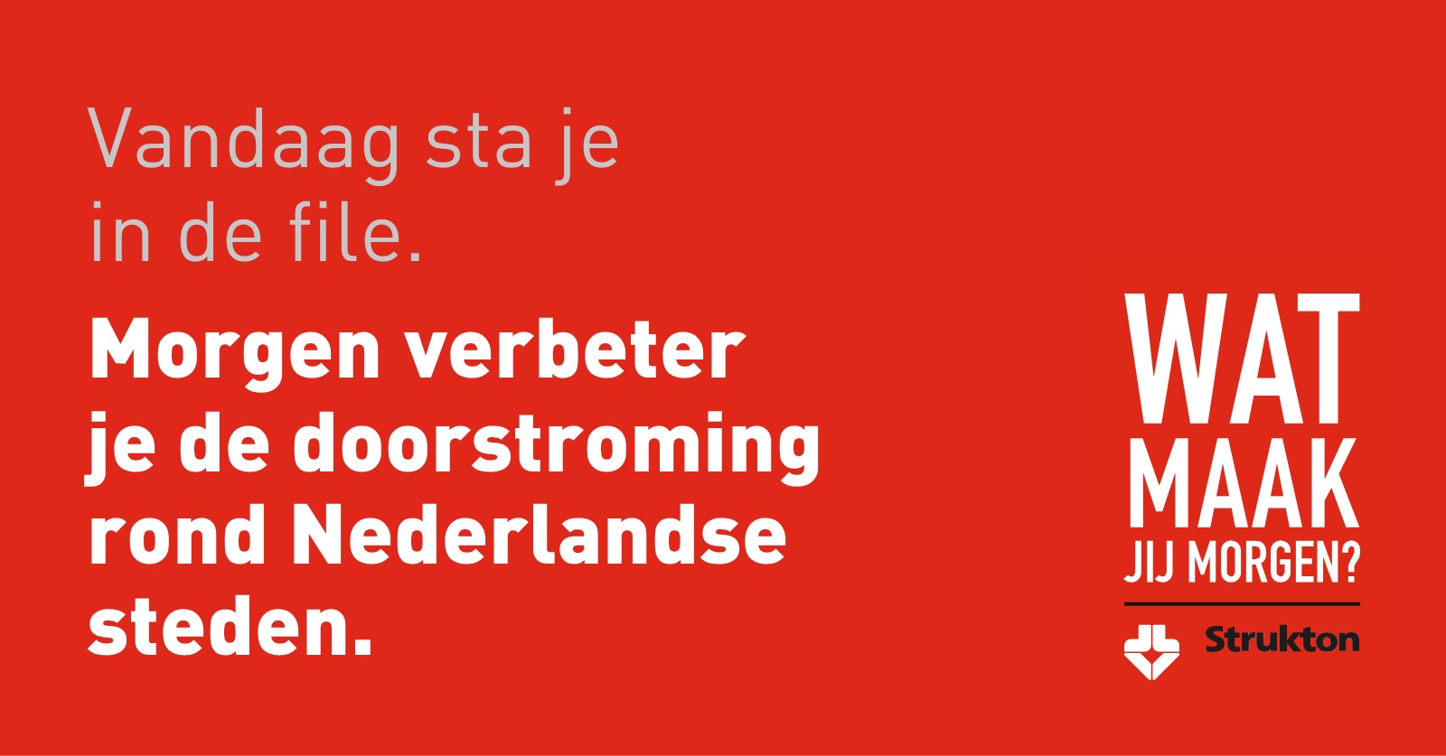 Vandaag maken we morgen. De behoefte aan reizen en vervoeren in ons land is groot. Bereikbaarheid is een grote uitdaging. Onze klanten willen hun beloftes waarmaken over een fijne leefomgeving en duurzaamheid. Bij Strukton kijken we samen vooruit. Wij dragen bij aan een veilige en bereikbare wereld, nu en in de toekomst. Met een focus op duurzame infrastructuur. Wat maak jij morgen?